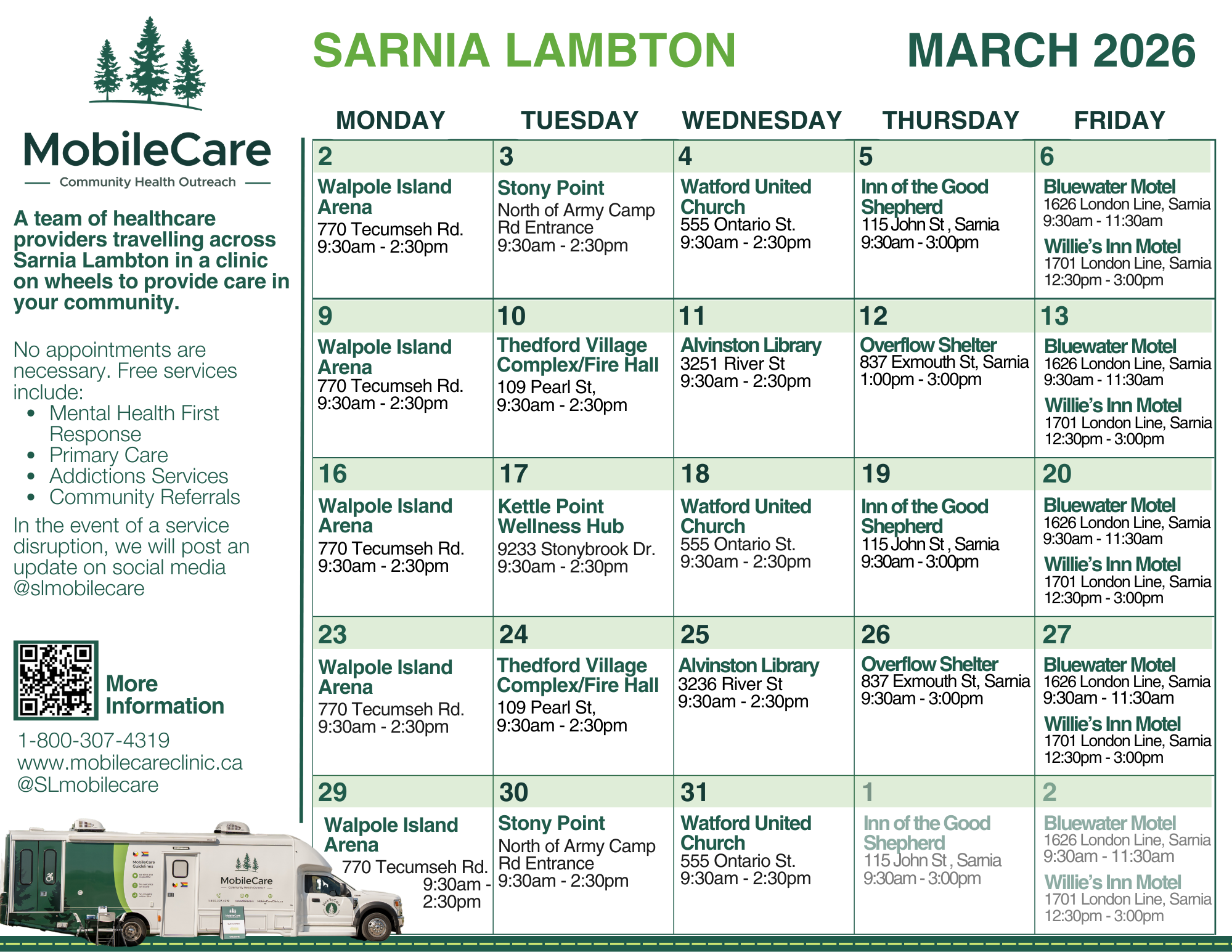 Scroll down or click here for the Sarnia Lambton MobileCare schedule and locations.
